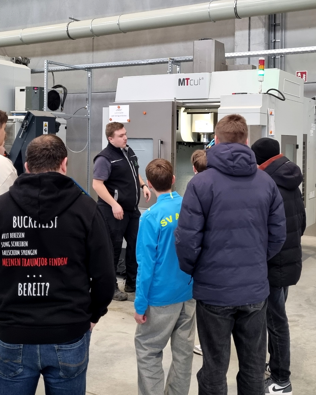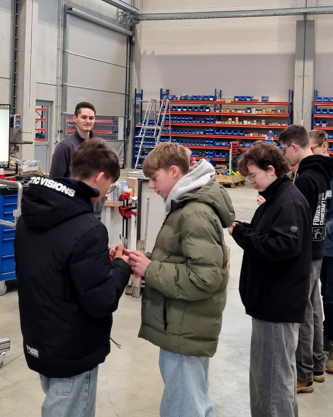 Statt Theorie im Klassenzimmer hieß es bei uns: Einblicke in echte Arbeitsabläufe, Gespräche mit unseren Auszubildenden und Technik zum Anfassen. Während des rund 90-minütigen Besuchs stellten wir unser Unternehmen, unsere Ausbildungsberufe sowie konkrete Karriereperspektiven im Maschinen- und Anlagenbau vor. Besonders wertvoll war der direkte Austausch – Fragen konnten offen gestellt und aus erster Hand beantwortet werden.